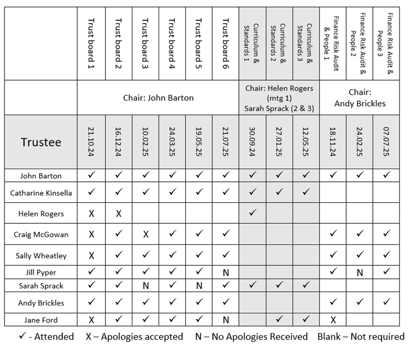 The Board of Trustees also have the sub-committees listed below and address specific areas of responsibility and support the overall governance and management of the trust: