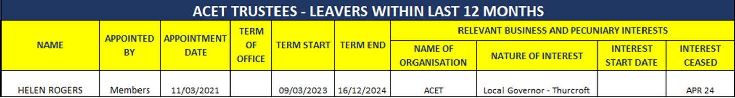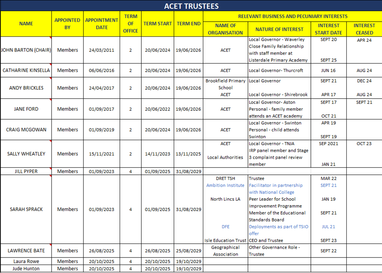 Our Board of Trustees play a crucial role in overseeing the governance and strategic direction of the trust. Trustees are responsible for setting the overall vision, values, and goals of the trust, as well as ensuring that all our academies provide high-quality education and achieve excellent outcomes for all pupils/students. They have a duty to act in the best interests of the trust and our academies, ensuring compliance with legal and regulatory requirements. Trustees make important decisions related to finance, staffing, curriculum, and policies, working closely with the CEO/executive leaders and Principals. They also monitor the performance of the trust and its academies, holding them accountable for achieving their objectives. Through their collective expertise and commitment, Trustees contribute to the success and growth of ACET.
